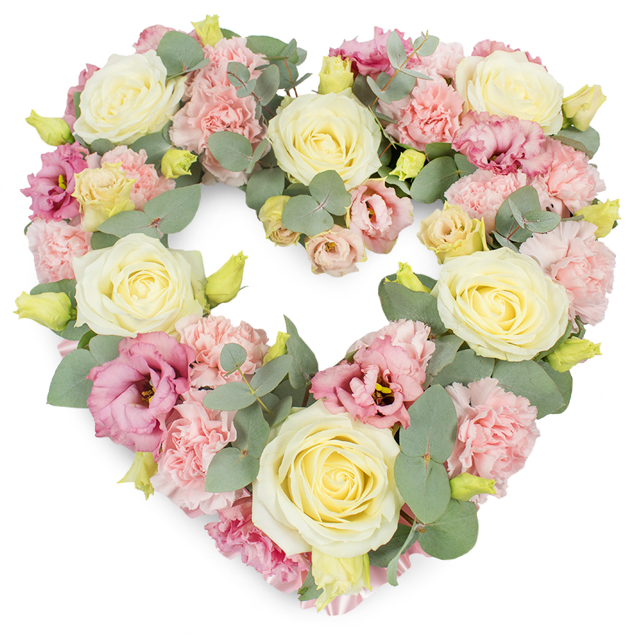 Our Sophisticated Open Heart Floral Tribute is a graceful way to honor loved ones. This elegant bouquet features white roses, pink carnations, pink lisianthus, and eucalyptus leaves, meticulously arranged to create a beautiful and meaningful tribute.